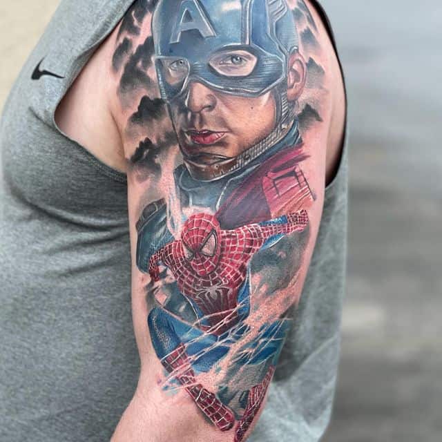 Ще один відомий голлівудський красень – актор Кріс Еванс втілив у кіновсесвіті Marvel персонажа – Капітан Америка. Цей персонаж задуманий як ідеальний, досконалий. Власне, так само він і виглядає в кіно. Тому тату з його зображенням теж часто роблять в реалістичному вигляді за мотивами фільмів.