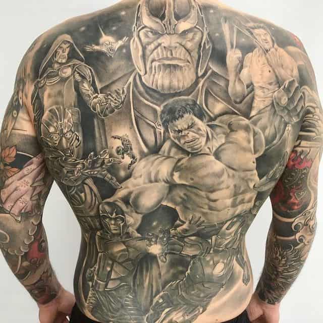 Також дуже часто набивають татуювання із зображенням Халка. Цей персонаж також дуже впізнаваний: дуже висока, сильна і могутня людина з зеленою шкірою стала символом мужності, нестримної внутрішньої сили. Тому саме чоловіки дуже люблять наносити його на шкіру у вигляді натільного малюнка, щоб проявити відповідні якості в собі.