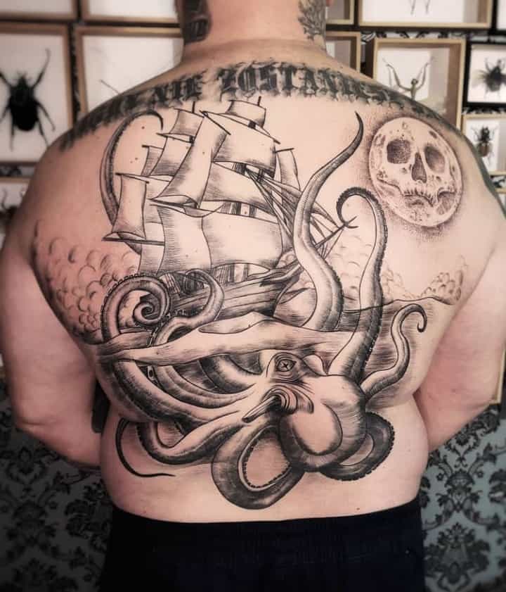 На спині розкішно виглядають обладунки, батальні сюжети, середньовічні лицарі, самураї. Тату вказують на силу, рішучість, стійкість перед труднощами, безжальність до ворогів.