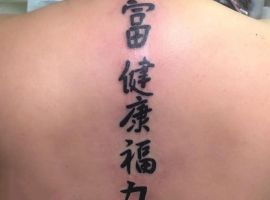 Уздовж хребта і між лопатками роблять написи латиною, російською або іноземною мовою, арабською в’яззю. Найбільш улюблені чоловіками Китайські і японські ієрогліфи, важливо тільки написати їх правильно, щоб не осоромитися.
