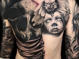 Груди як зона для татуювання вирізняються своєю анатомічною гнучкістю: шкіра тут еластична, що дозволяє малюнку “рухатися” разом з тілом без спотворень. Це робить тату на грудях стійкими до часу, адже природні вигини ключиць і м’язів додають дизайну динаміки. Близькість до серця додає символізму – багато хто обирає мотиви, пов’язані з емоціями чи захистом, роблячи татуювання не просто декором, а талісманом.
