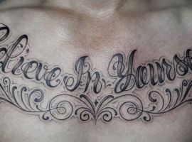 - Зверху великий напис: Горизонтальний текст над ключицями виглядає ефектно, легко читається і додає мотиваційного штриху. Ідеально для фраз, що надихають, з урахуванням природного вигину.