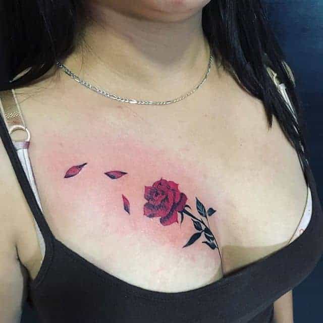 - Між грудьми: Вертикальний дизайн у центрі, як ланцюжок чи квітка, підкреслює декольте. Це додає елегантності, особливо для жіночих тату.