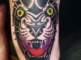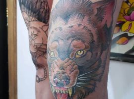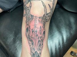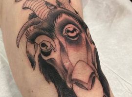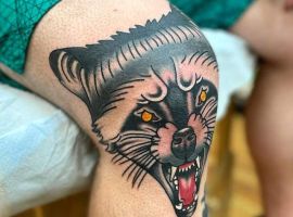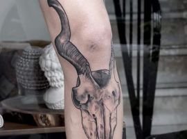 Відмінний варіант для татуювання на коліні – це зображення тварини. Смислового навантаження тут мінімальна кількість. За фото можна побачити, як цікаво виглядають морди рогатих, наприклад, оленя або козла. Тварини можуть бути і іншими. Наприклад, зайчик, кішка, вовки, лев і багато інших. Зона коліна кругла, овальна, тому тут виходить відмінно розмістити мордочки різних звірів, так як вони теж схожою форми.