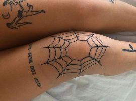 Інший цікавий варіант – це татуювання у вигляді павукової мережі. Виглядає така дуже цікаво, здається, що вона оточила ногу людини. Часто цю павутинку доповнюють і зображенням самого павука, який плавно переміщається по тілу.