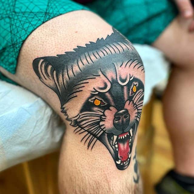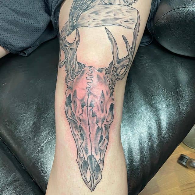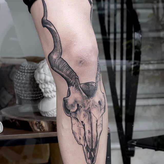 Відмінний варіант для татуювання на коліні – це зображення тварини. Смислового навантаження тут мінімальна кількість. За фото можна побачити, як цікаво виглядають морди рогатих, наприклад, оленя або козла. Тварини можуть бути і іншими. Наприклад, зайчик, кішка, вовки, лев і багато інших. Зона коліна кругла, овальна, тому тут виходить відмінно розмістити мордочки різних звірів, так як вони теж схожою форми.