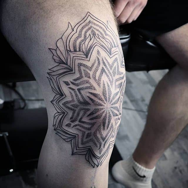 В якості основи для малюнка можна взяти і різні мандали. Як правило, виконуються ці східні обереги в круглій формі. На коліні вони виглядають просто відмінно. Перевага мандал, як, втім, і будь-яких інших подібних символів, в тому, що ними можна відмінно замаскувати шрами на колінах.