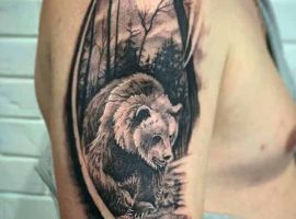 Ведмідь. Ці татуювання на плечі чоловічі, розкривають кращі якості: інтелект, силу, спокій, впевненість. Представникам сильної статі хочеться асоціювати себе з потужним господарем тайги.