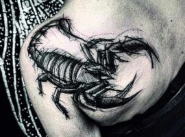 Скорпіон. Татуювання зазвичай роблять представники зодіакального знака Скорпіон. Це ідеї чоловічі зі змістом мудрості і благородства. Членистоноге, набите з трояндою, означає, що людина щаслива в шлюбі.