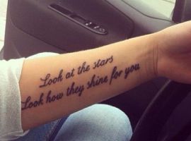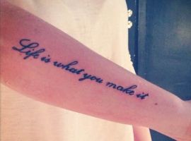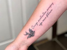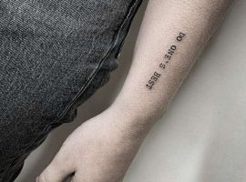 Часто татуювання на руках робляться зі всілякими фразами латинською мовою. Чому саме Латинь? По-перше, вислови древніх філософів відрізняються глибиною, і багато хто вибирає їх в якості життєвого девізу. По-друге, такі ідеї можна виконувати в будь-яких стилях, що дозволяє майстру створити справжній шедевр. Залежно від обраного шрифту вони будуть виглядати по-різному: це може бути витончений «рукописний» варіант або лаконічні Готичні букви. Відмінно виглядає шрифт, стилізований під машинописний.