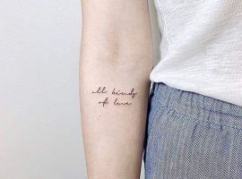 - “All you need is love” (ти потребуєш тільки любові). Рядок з популярної пісні групи “Beatles” підходить особистостям, які вважають, що любов – головний шлях до щастя і гармонії. При цьому може матися на увазі як любов до інших людей, так і до самого себе. Можна прикрасити текст сердечками і яскравими квітами;