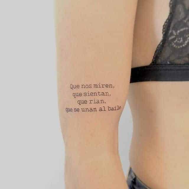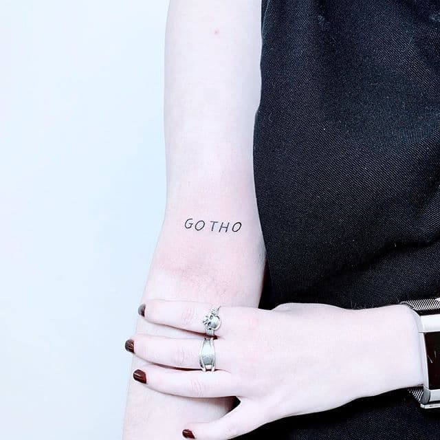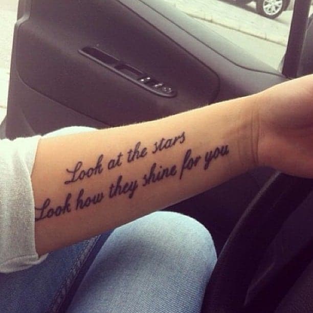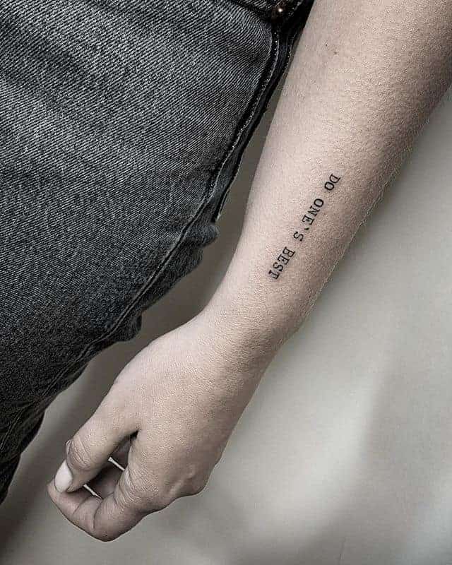 Часто татуювання на руках робляться зі всілякими фразами латинською мовою. Чому саме Латинь? По-перше, вислови древніх філософів відрізняються глибиною, і багато хто вибирає їх в якості життєвого девізу. По-друге, такі ідеї можна виконувати в будь-яких стилях, що дозволяє майстру створити справжній шедевр. Залежно від обраного шрифту вони будуть виглядати по-різному: це може бути витончений «рукописний» варіант або лаконічні Готичні букви. Відмінно виглядає шрифт, стилізований під машинописний.
