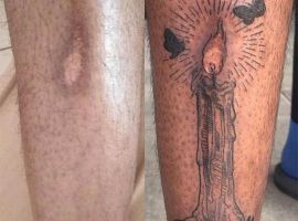 - Келоїдний рубець – правильніше сказати пухлина. Вона червона або синювата, помітно опукла, болюча. Робити тату на келоїдному рубці категорично заборонено. Інтенсивний механічний вплив і введення пігменту під шкіру посилять запальний процес. Тканини, що рубцюються змінюються, деформуються, і незабаром татуювання, нанесене на келоїдний дефект, спотвориться, знайде невпізнанний вигляд.