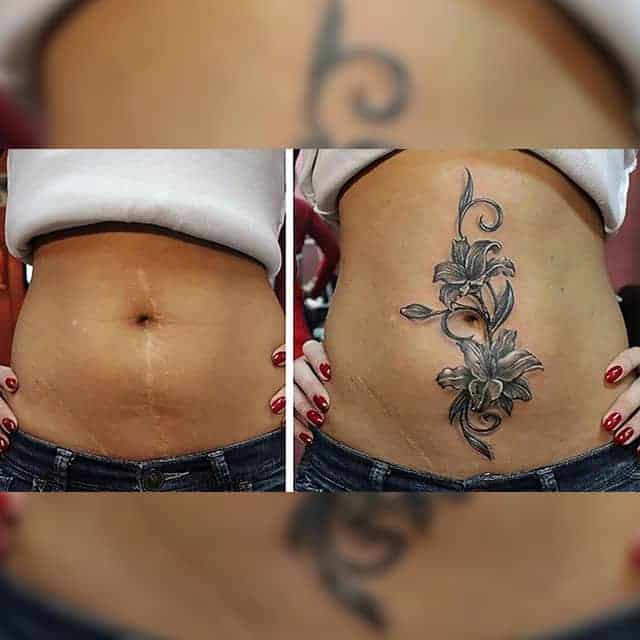 Шрам від кесарева виглядає як поперечна смуга в нижній частині живота. Для молодих жінок – серйозний привід для формування комплексів. Існує багато симпатичних жіночих варіантів татуювання на шрамах внизу живота:
