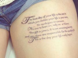 Для набивання на стегні, рекомендують вибирати короткі написи, які будуть мати смислове навантаження. При виборі вислову або слова іноземною мовою потрібно точно з’ясувати, як воно перекладається, щоб не опинитися в незручній ситуації, так як татуювання залишиться на все життя.