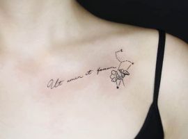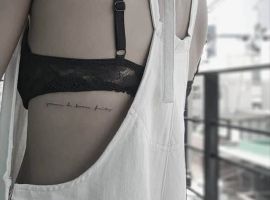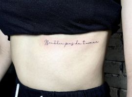 Найбільш пристрасне і сексуальне місце на жіночому тілі для такої ідеї – низ живота. Якщо сюди наносять татуювання написи зі змістом на латині. То вони завжди мають грайливий натяк і призначені не для поглядів сторонніх, а тільки для однієї єдиної людини. Часто поруч з фразою зображують якийсь символ або міні малюнок, який підсилює підтекст.