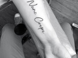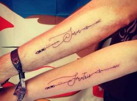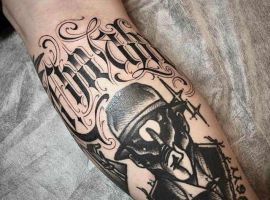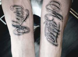 Але найпопулярніші серед молодих людей-тату написи на руці. Передпліччя-ідеальне місце для такої ідеї. По-перше, воно довгасте і рівне, а шкіра особливо не деформується при русі. Це робить процес нанесення максимально зручним. А сама фраза гармонійно лягає на довгасту ділянку. Причому можна розташувати і одне слово, і великий текст в кілька рядків, вдало підібравши разом з майстром шрифт і розмір. Татуювання на руках взагалі найбільш поширені серед чоловіків. Як на внутрішній, так і на зовнішній, і на бічній сторонах передпліччя вони виглядають дуже органічно. Звичайно, це за умови, що ви знайдете досвідченого майстра, який розуміє, як грамотно розташувати картинку, щоб вона гармонійно виглядала, виходячи з анатомічних особливостей руки.