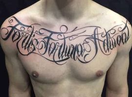 Серед представників сильної статі також популярні написи на латині. Чоловікам важливо, щоб з перекладом передавалися і підкреслювалися чоловічі якості: сила як зовнішня, так і внутрішня, сила духу, впевненість, відвага, цілеспрямованість і мудрість. Також в моді фрази-девізи. Своєрідні постулати, з якими людина йде по життю, те, що для неї найголовніше, особисте і особливе. Але якщо дівчата втілюють такі ідеї в мініатюрі в прихованих місцях, то молодим людям навпаки подобається наносити об’ємні, великі написи на відкритих місцях. Найчастіше вибирають: руку, плече, груди, спину, стегно і гомілку.