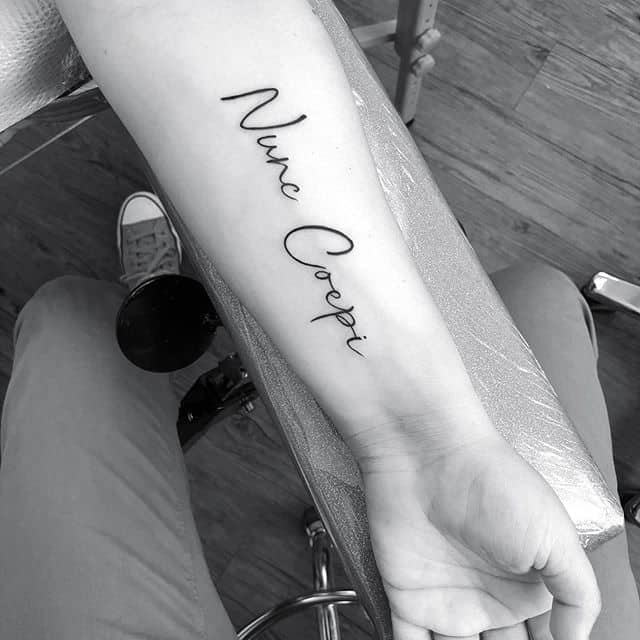 Є кілька різновидів написів, які найчастіше наносять на шкіру. Наймініатюрніша ідея-буква або ініціали. Найчастіше підходять такі татуювання для батьків, які хочуть завжди носити з собою нагадування про найбільше диво в житті, про найріднішу людину – про свого малюка; у вигляді першої літери його імені.