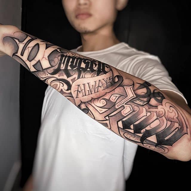 Досвідчені майстри легко допоможуть підібрати ескізи тату написи, або ж створити їх самостійно, вибравши відповідний шрифт безпосередньо перед сеансом. Хлопці віддають перевагу грубим шрифтам, з товстими, карбованими, різкими лініями і кутами. Останнім часом в моді стиль-Леттерінг. При цьому, якщо дівочі написи часто супроводжуються малюнками, квітами і візерунками; то чоловічі зазвичай – це окреме самодостатнє татуювання. Звичайно, якщо мова не йде про рукав (повністю забиту руку від плеча до зап’ястя), в такому випадку багато малюнків повинні бути об’єднані одним стилем і поєднуватися між собою. Те ж саме стосується тих, хто хоче забити повністю всю спину, груди, бік або ногу безліччю картинок і елементів, створивши об’ємну композицію.