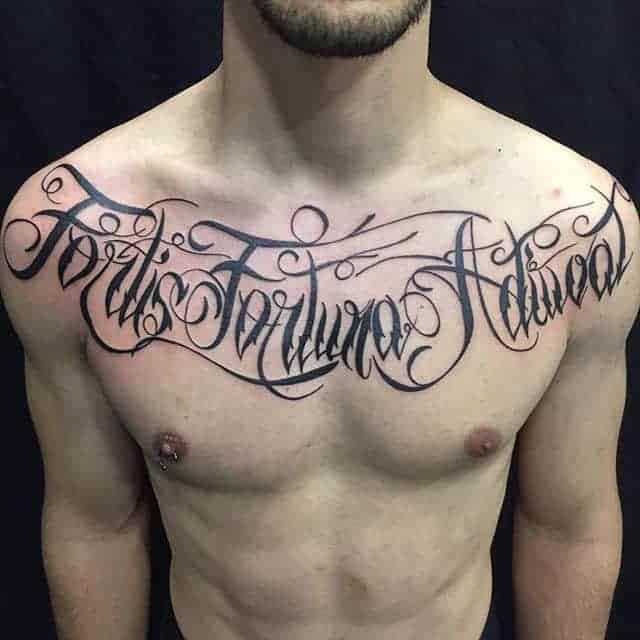 Серед представників сильної статі також популярні написи на латині. Чоловікам важливо, щоб з перекладом передавалися і підкреслювалися чоловічі якості: сила як зовнішня, так і внутрішня, сила духу, впевненість, відвага, цілеспрямованість і мудрість. Також в моді фрази-девізи. Своєрідні постулати, з якими людина йде по життю, те, що для неї найголовніше, особисте і особливе. Але якщо дівчата втілюють такі ідеї в мініатюрі в прихованих місцях, то молодим людям навпаки подобається наносити об’ємні, великі написи на відкритих місцях. Найчастіше вибирають: руку, плече, груди, спину, стегно і гомілку.