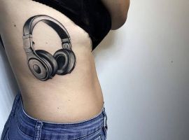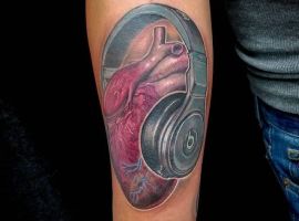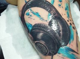 Тату з навушниками універсальне, його може вибрати і чоловік і дівчина, будь-якого розміру і стилю. Наносять на шкіру великі діджейські навушники, або маленькі вакуумні. Найчастіше вибирають чорно-біле зображення в реалістичному або графічному стилі, також нерідко в стилі треш-полька. В останньому випадку до чорно-білого зображення додають червоні елементи і смуги, що робить ідею більш оригінальною.