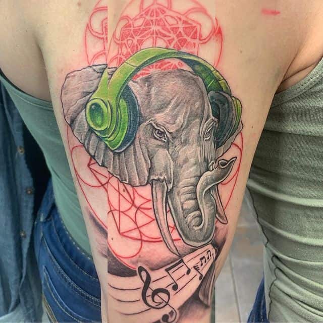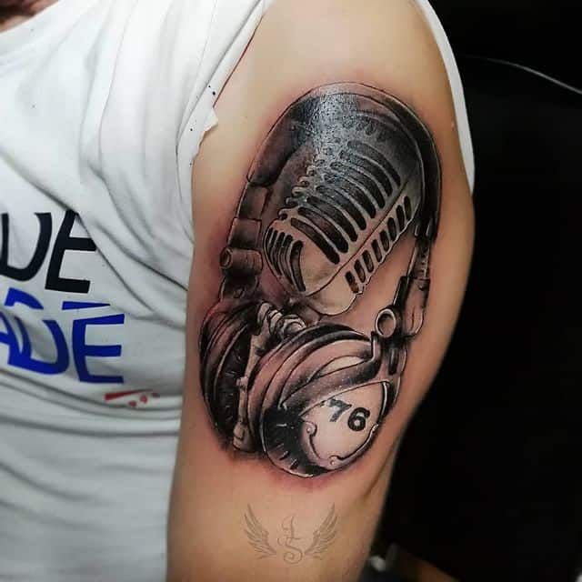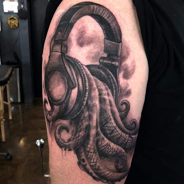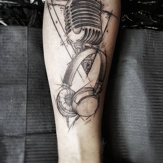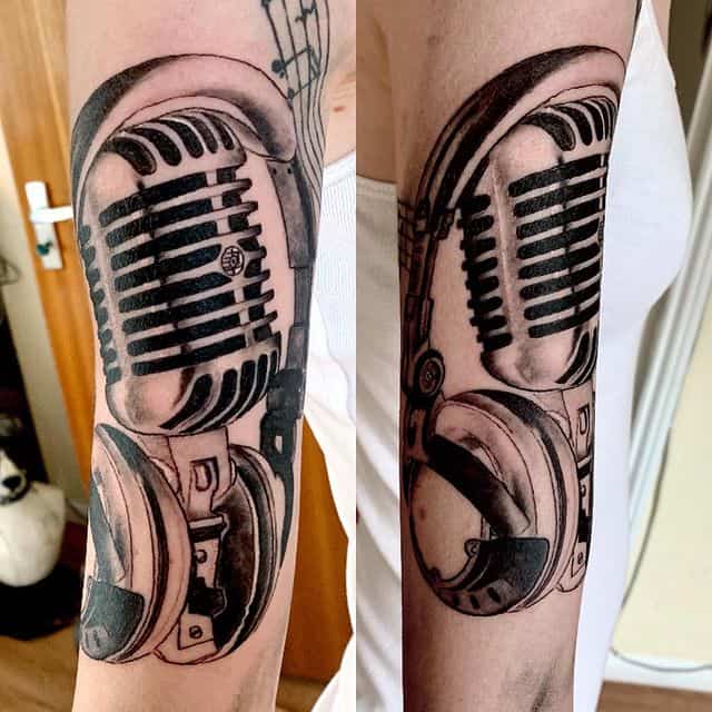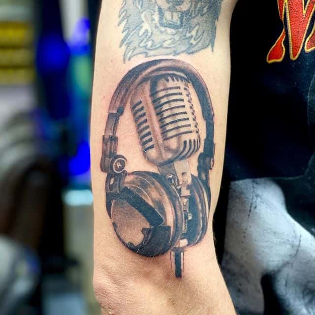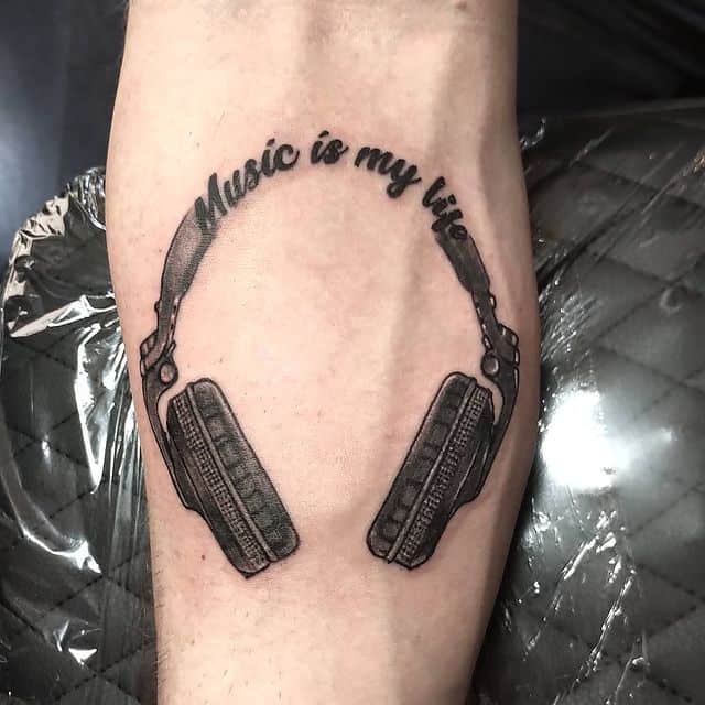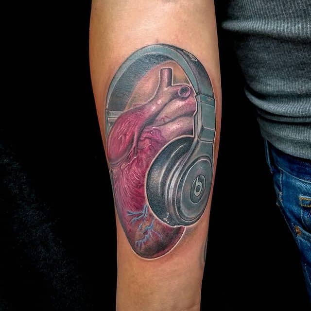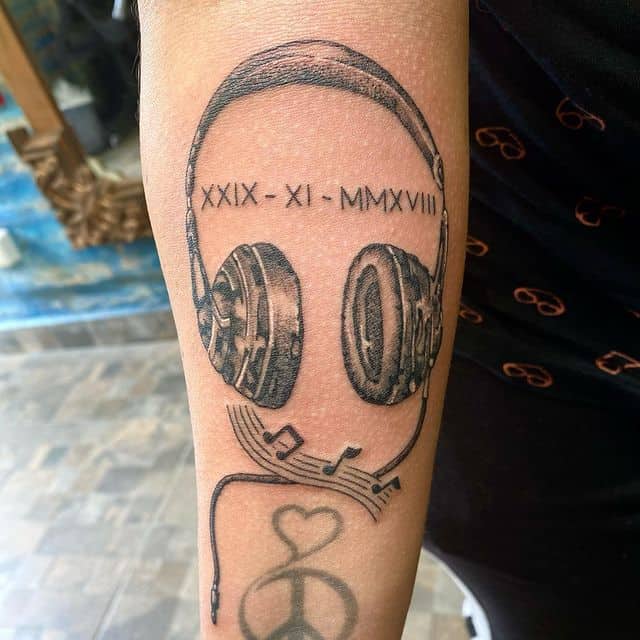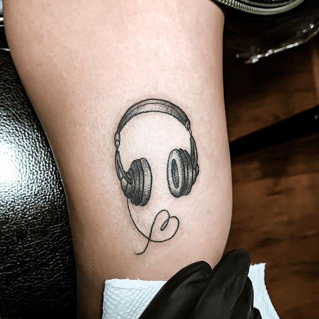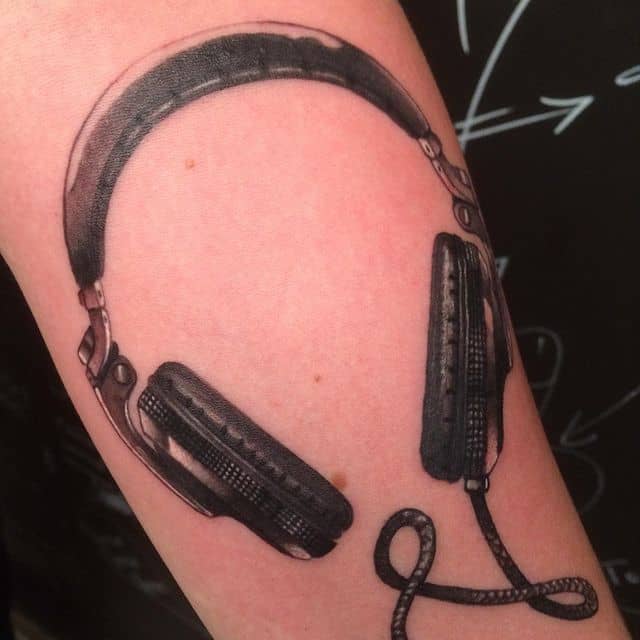 Тату з навушниками універсальне, його може вибрати і чоловік і дівчина, будь-якого розміру і стилю. Наносять на шкіру великі діджейські навушники, або маленькі вакуумні. Найчастіше вибирають чорно-біле зображення в реалістичному або графічному стилі, також нерідко в стилі треш-полька. В останньому випадку до чорно-білого зображення додають червоні елементи і смуги, що робить ідею більш оригінальною.