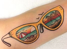 Значення татуювання окуляри стає зовсім іншим, якщо вони сонцезахисні. Це прямий символ літа, відпочинку і насолоди. Таку ідею обере людина, яка любить подорожувати по теплих країн, обожнює теплу пору року і відпочивати. Можна сказати, що це доброзичлива, позитивна і життєрадісна людина, яка вміє насолоджуватися кожною миттю. Такі окуляри в тату зазвичай або чорні, або в них відбивається яскравий пейзаж, наприклад, пляж, Сонце і пальми.