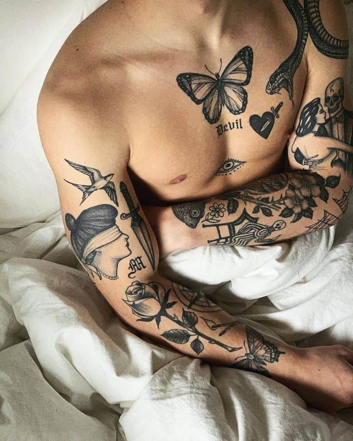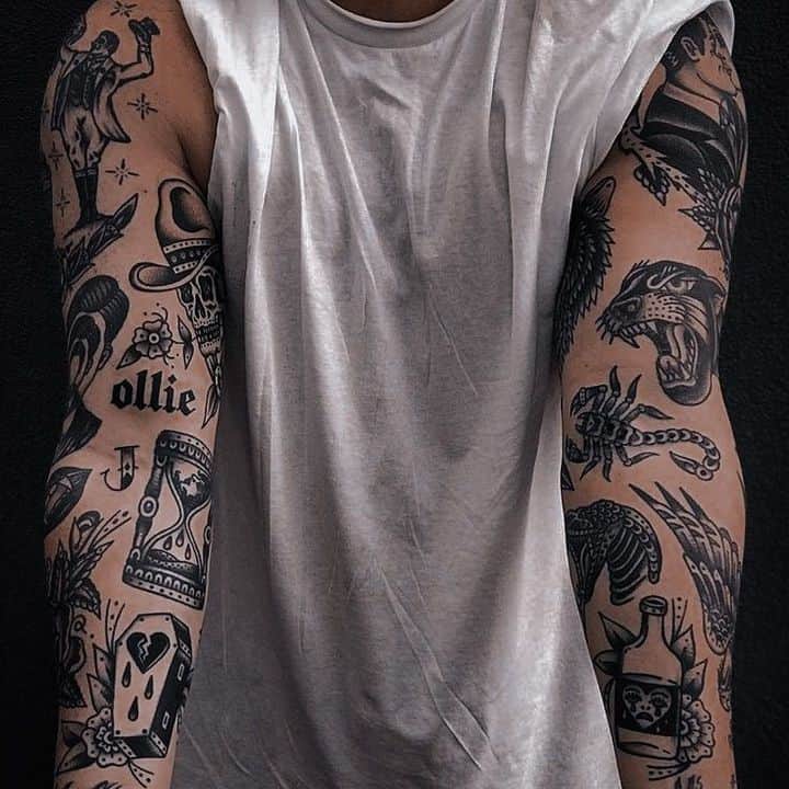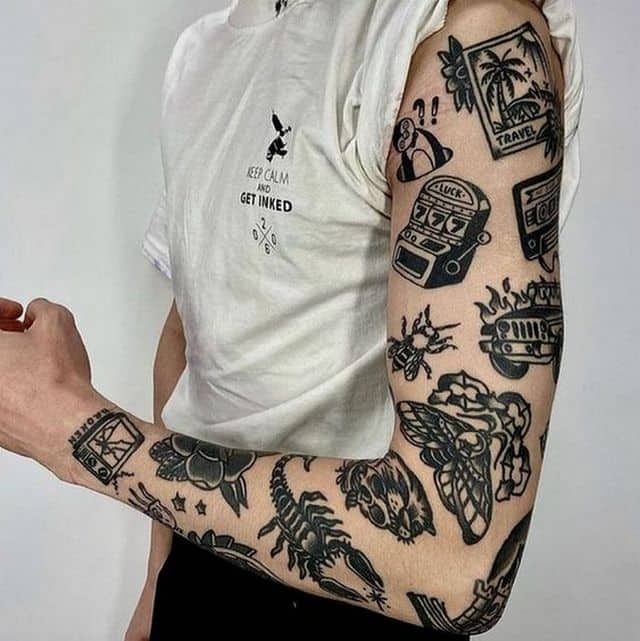 Якщо набито кілька маленьких ескізів, їх можна з’єднати в рукав або ногав. Також олдскульними мотивами можна фарбувати груди і шию.