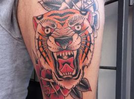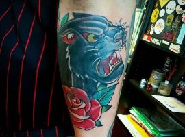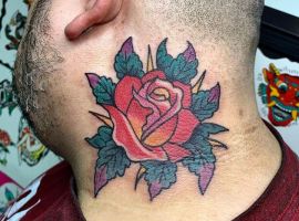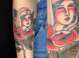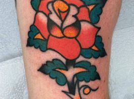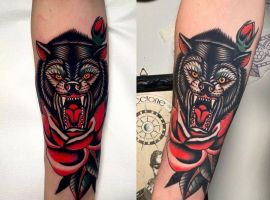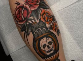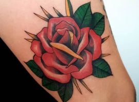 - Квіти: Зазвичай це рози, що представляють красу, пристрасть і тендітність життя. Роза може бути з шипами, символізуючи любов, яка долає біль. У стилі вона часто поєднується з іншими мотивами, додаючи романтики та нагадуючи про циклічність існування. Квіти роблять тату м’якшими, приваблюючи тих, хто шукає баланс сили та ніжності.
