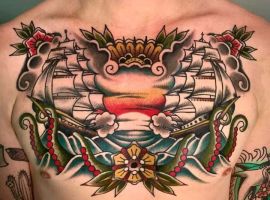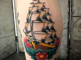 - Корабель: Цей образ символізує пригоди, подолання викликів і рух уперед. Корабель пливе через хвилі, уособлюючи сміливість і готовність до невідомого. Моряки татуювали його як знак перемоги над стихією, а сьогодні він надихає на зміни та нові горизонти. Деталі, як вітрила чи хвилі, додають динаміки.