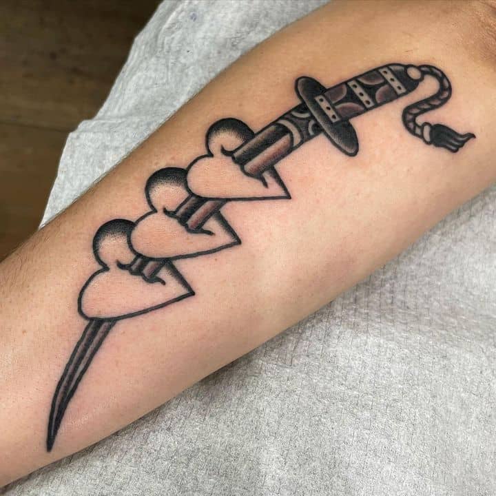 - Серце: Найемоційніший елемент, що втілює любов, пристрасть і зв’язки. Серце може бути пронзеним чи з написом, показуючи глибокі почуття чи рани. Воно нагадує про близьких, роблячи тату емоційним якорем у житті. Серця часто поєднують з стрілами чи квітами для повнішої історії.