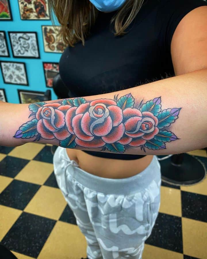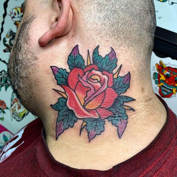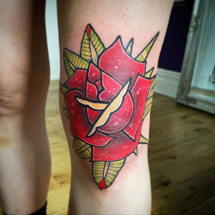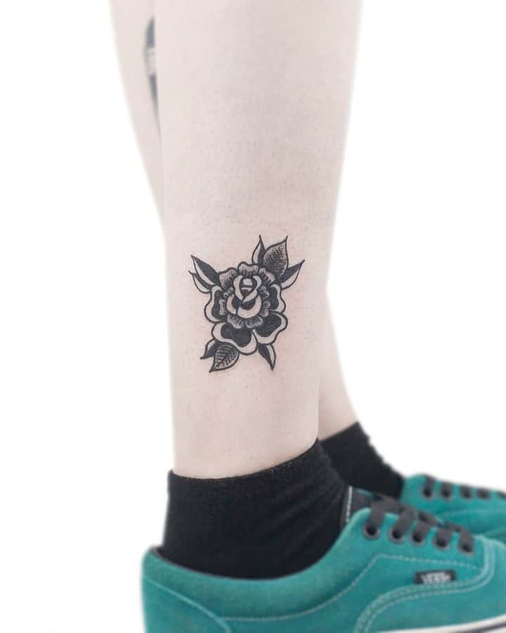 - Квіти: Зазвичай це рози, що представляють красу, пристрасть і тендітність життя. Роза може бути з шипами, символізуючи любов, яка долає біль. У стилі вона часто поєднується з іншими мотивами, додаючи романтики та нагадуючи про циклічність існування. Квіти роблять тату м’якшими, приваблюючи тих, хто шукає баланс сили та ніжності.