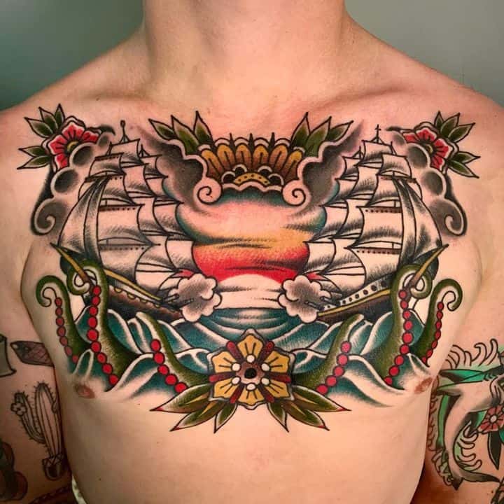 - Корабель: Цей образ символізує пригоди, подолання викликів і рух уперед. Корабель пливе через хвилі, уособлюючи сміливість і готовність до невідомого. Моряки татуювали його як знак перемоги над стихією, а сьогодні він надихає на зміни та нові горизонти. Деталі, як вітрила чи хвилі, додають динаміки.