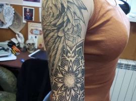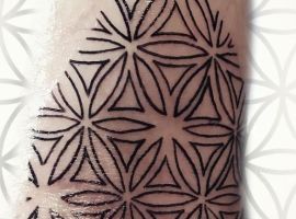 - Часто візерунки поєднуються з квітами. Популярно зображення лотоса в цьому стилі. Він символізує циклічність життя, процвітання, божественне начало, довголіття. Такий малюнок вибирають ті, хто захоплюється езотерикою, індійською філософією. Підходить він впевненим у собі людям.