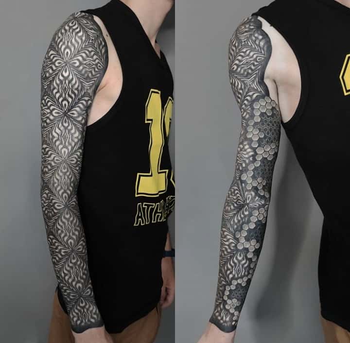 Досвідчений майстер може поєднувати різні техніки, створюючи складні оригінальні візерунки. Часто вони займають великий простір. Особливо популярні в такому стилі тату рукава, масштабні зображення на спині або грудях.