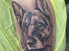 Звичайно, найчастіше зображують просто добру розумну мордочку. Найкраще таке татуювання виглядає в стилі реалізм, як чорно-білому, так і кольоровому. Реалістичне зображення дуже складне і має безліч дрібних деталей і колірних переходів, а тому вимагає великої ділянки шкіри. Тому такі тату наносять на об’ємні місця: плече, груди, спину, передпліччя. Проконсультуйтеся з нашими майстрами у Києві.