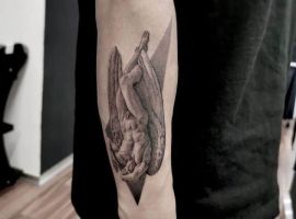 - гравюра. Зображення павшого ангела можна стилізувати під середньовічну гравюру. Такі татуювання здаються лаконічними і непогано виглядають на тілі. Щоб зображення вийшло більш об’ємним, можна попросити, щоб майстер використовував кілька відтінків сірого і додав тіней;