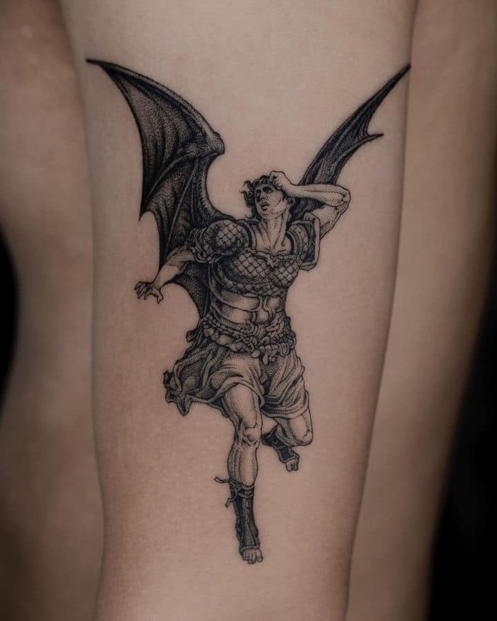 - гравюра. Зображення павшого ангела можна стилізувати під середньовічну гравюру. Такі татуювання здаються лаконічними і непогано виглядають на тілі. Щоб зображення вийшло більш об’ємним, можна попросити, щоб майстер використовував кілька відтінків сірого і додав тіней;
