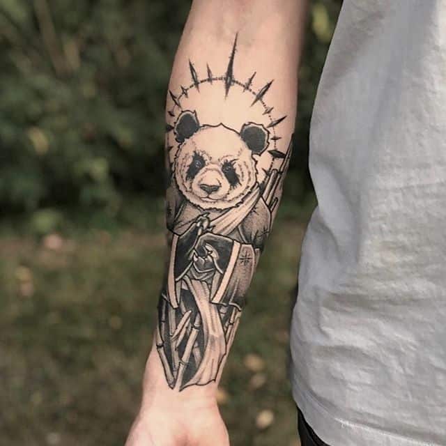 Панда з автоматом – неординарна тату. Вона говорить про те, що хлопець тільки на вигляд здається добродушним і нездатним захищати свої інтереси. Насправді він готовий захищати те, що йому дорого. Татуювання означає: я добрий, але краще не злити.