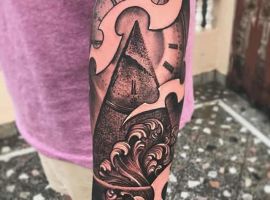 Зустрічається ще й піраміда, зображена в морській стихії – в морських хвилях, на вітрі. В такому випадку тату матиме значення внутрішньої сили, стійкості, могутності людини, його здатність встояти перед будь-якими випробуваннями цього світу, не зламатися і не здаватися.