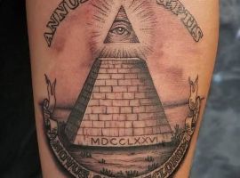Також поширеним є зображення піраміди на доларовій купюрі. Воно також має в своїй конструкції як елемент всевидюче око. Але повтор саме цього зображення, з грошової купюри відразу приносить інший сенс татуюванню. Такий знак може позначати прагнення до порядку, при чому не окремо кожного представника людства, але і всього світу в цілому.