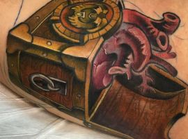 - Тату Піратський череп на скрині з золотом вказує на швидкоплинність життя. Насолоджуйтесь кожним днем, адже нажите не забереш в могилу. Татуювання пірат у вигляді ожилого скелета добре виглядає як рукав, означає безсмертність ідей і принципів.