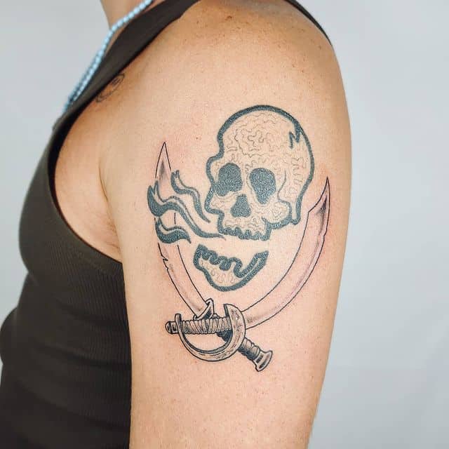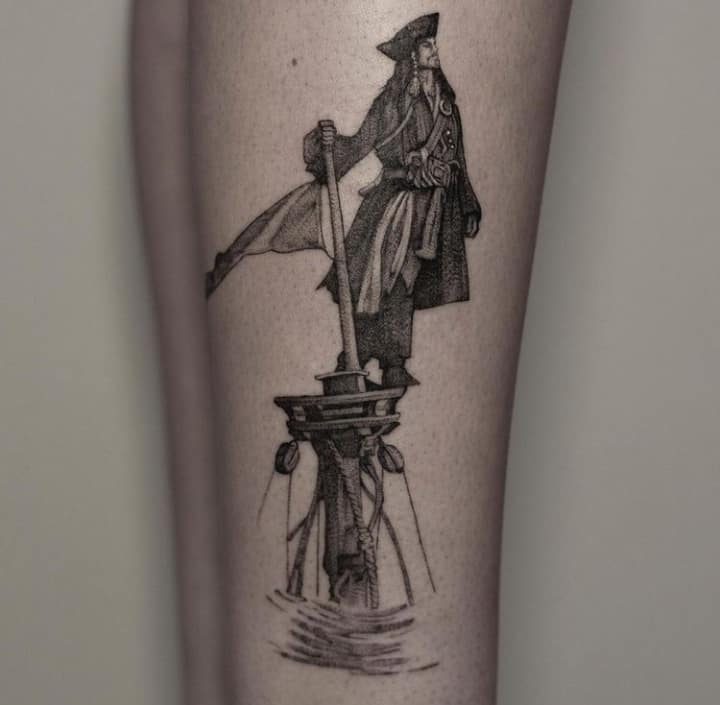 - Головне значення тату пірата – надія на фортуну, а не на працю, пошук легких шляхів. У чоловіків популярне сатиричне тату пірата на руці з трубкою, чорною пов’язкою на оці, папугою на плечі – символ внутрішнього бунту, неприйняття суспільних норм, безладного способу життя. Тату піратка вказує на порочність, небезпеку інтимних зв’язків.