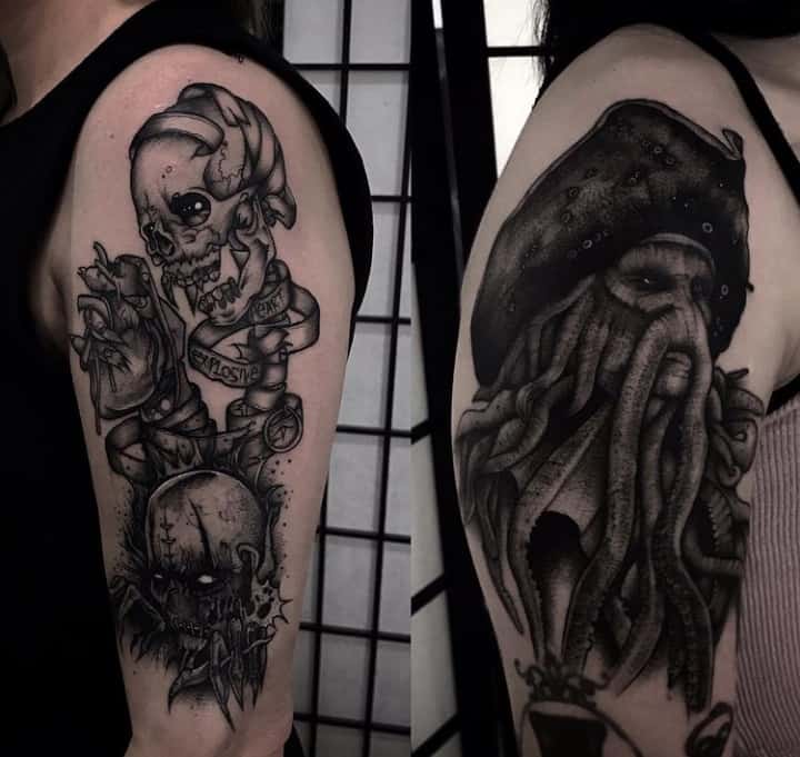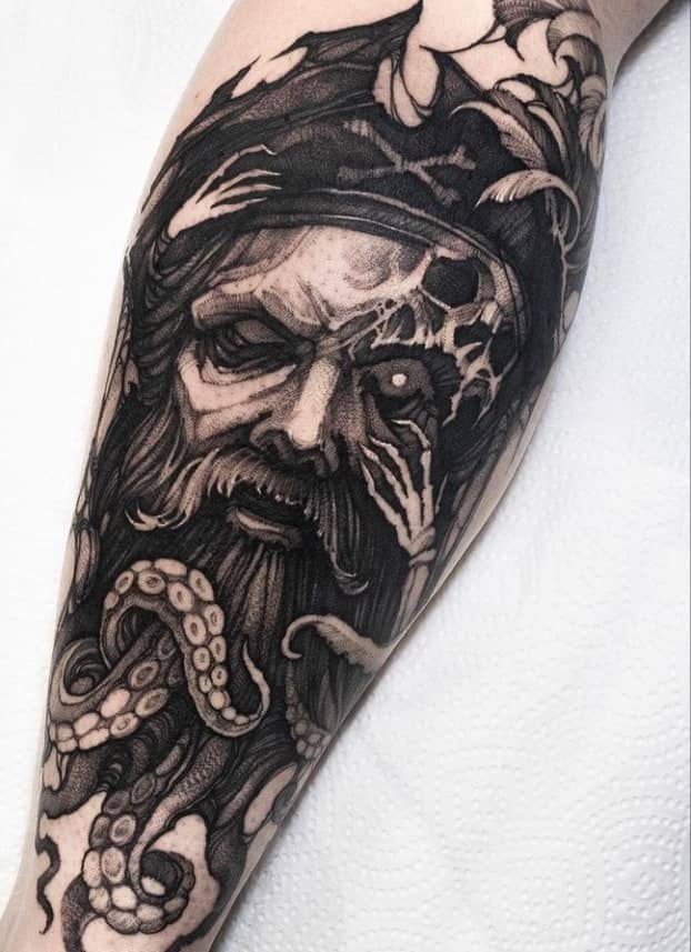 Морські татуювання підходить сміливим, цілеспрямованим, волелюбним. Пірат тату для людини щасливої, спраглої до перемоги, що ризикує по-крупному. Підводні пейзажі, Пірати, кораблі складні у виконанні, особливо в стилі реалізм, тому вибирайте досвідченого татуювальника в нашому салоні в Києві, з хорошими рекомендаціями.
