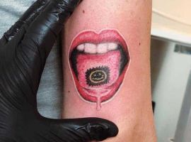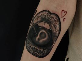 - Особливу розкутість несе в собі ескіз, де є язик. Так дама натякає на більш сексуальні відносини. Малюнок губ саме з язиком наносять на тіло дівчата, більш розкуті в знайомствах і зв’язках.