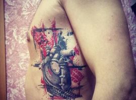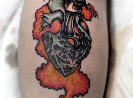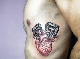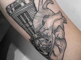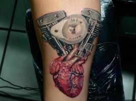 - Людське серце, поєднане з двигуном або яке складається з механічних деталей, символізує чоловіка, якого не хвилюють зручності або розкіш. Він може жити в будь-якій обстановці. Часто власники такого татуювання – це люди, які проводять життя на колесах, весь час в дорозі, невпинно рухаються до своєї мети. Якщо серце повністю являє собою двигун, це символ богатирського здоров’я.