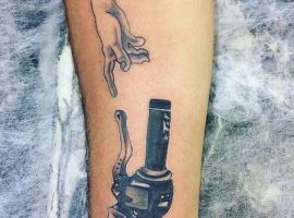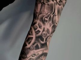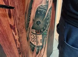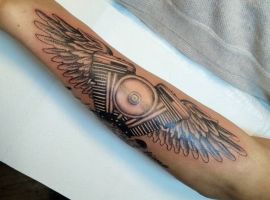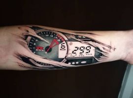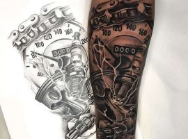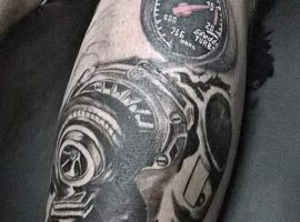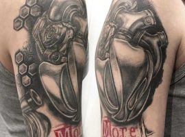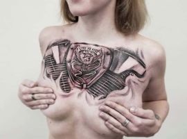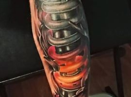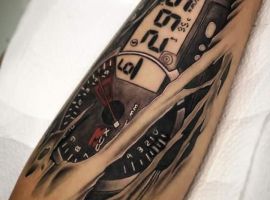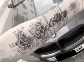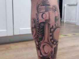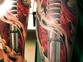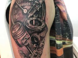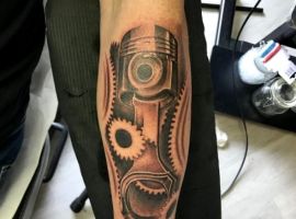 Але зазвичай для татуювання поршень і двигун використовується стиль біомеханіка. Це об’ємне, 3D зображення, дуже реалістичне. Дійсно створюється враження, ніби через розірвану шкіру і м’язи проглядають механічні деталі, як у робота. Часто такий стиль зображення вибирають чоловіки, охочі підкреслити рельєфність м’язів.