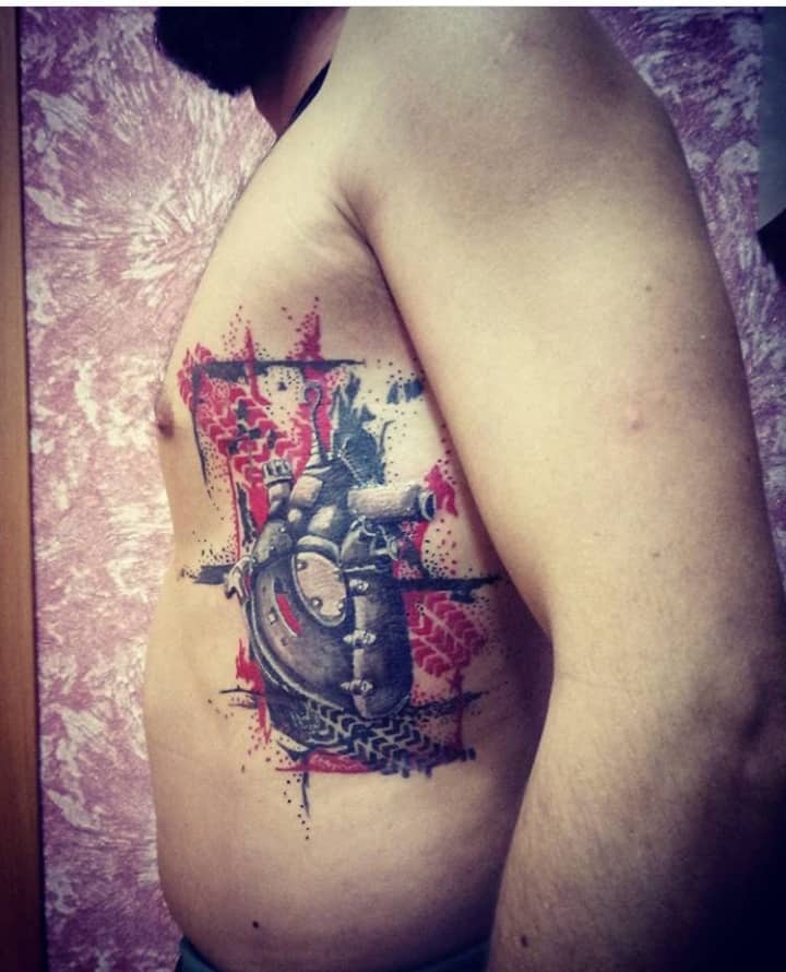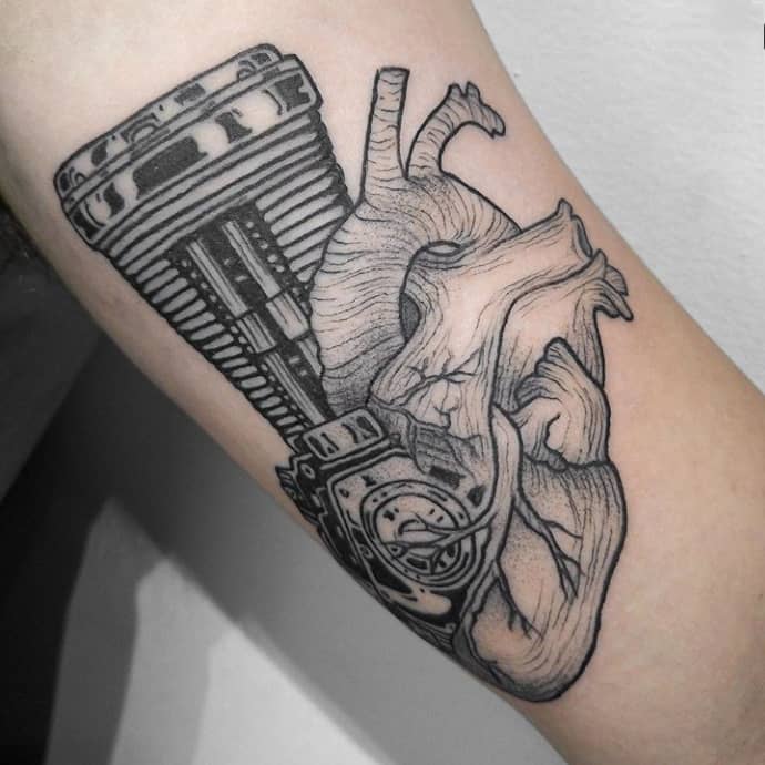 - Людське серце, поєднане з двигуном або яке складається з механічних деталей, символізує чоловіка, якого не хвилюють зручності або розкіш. Він може жити в будь-якій обстановці. Часто власники такого татуювання – це люди, які проводять життя на колесах, весь час в дорозі, невпинно рухаються до своєї мети. Якщо серце повністю являє собою двигун, це символ богатирського здоров’я.