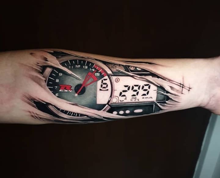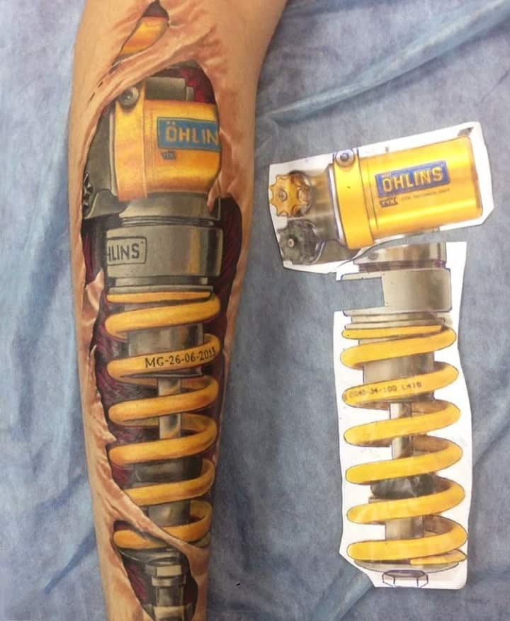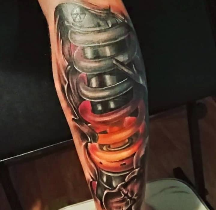 Але зазвичай для татуювання поршень і двигун використовується стиль біомеханіка. Це об’ємне, 3D зображення, дуже реалістичне. Дійсно створюється враження, ніби через розірвану шкіру і м’язи проглядають механічні деталі, як у робота. Часто такий стиль зображення вибирають чоловіки, охочі підкреслити рельєфність м’язів.